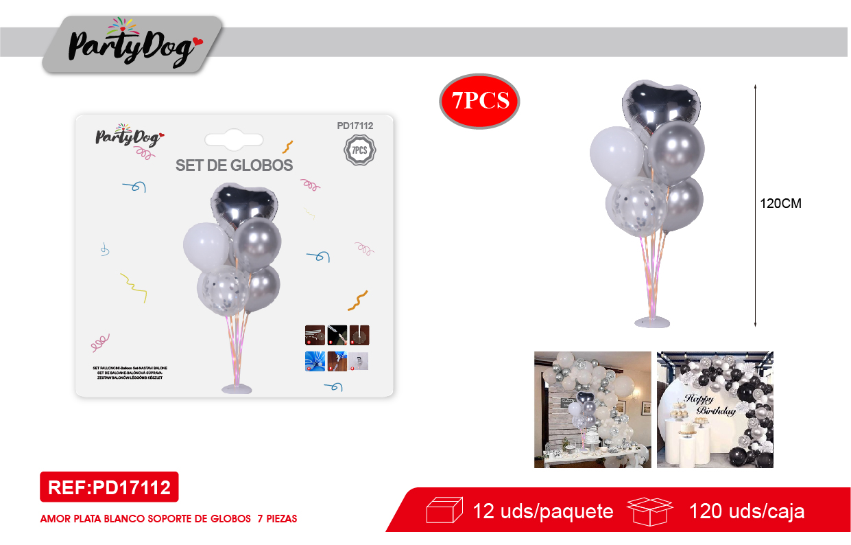SET DE GLOBOS COROZON CON LUCES PLATEADO 120CM 7PCS